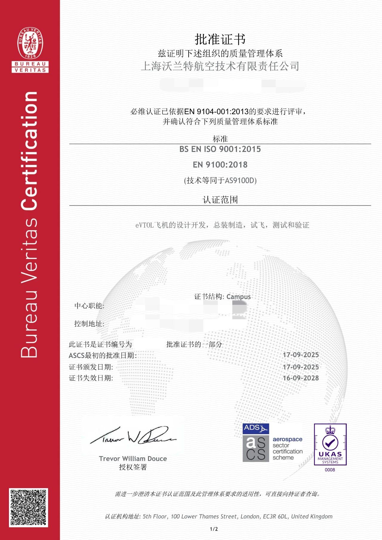青松基金被投企业「沃兰特航空」获AS9100D航空航天质量管理体系认证