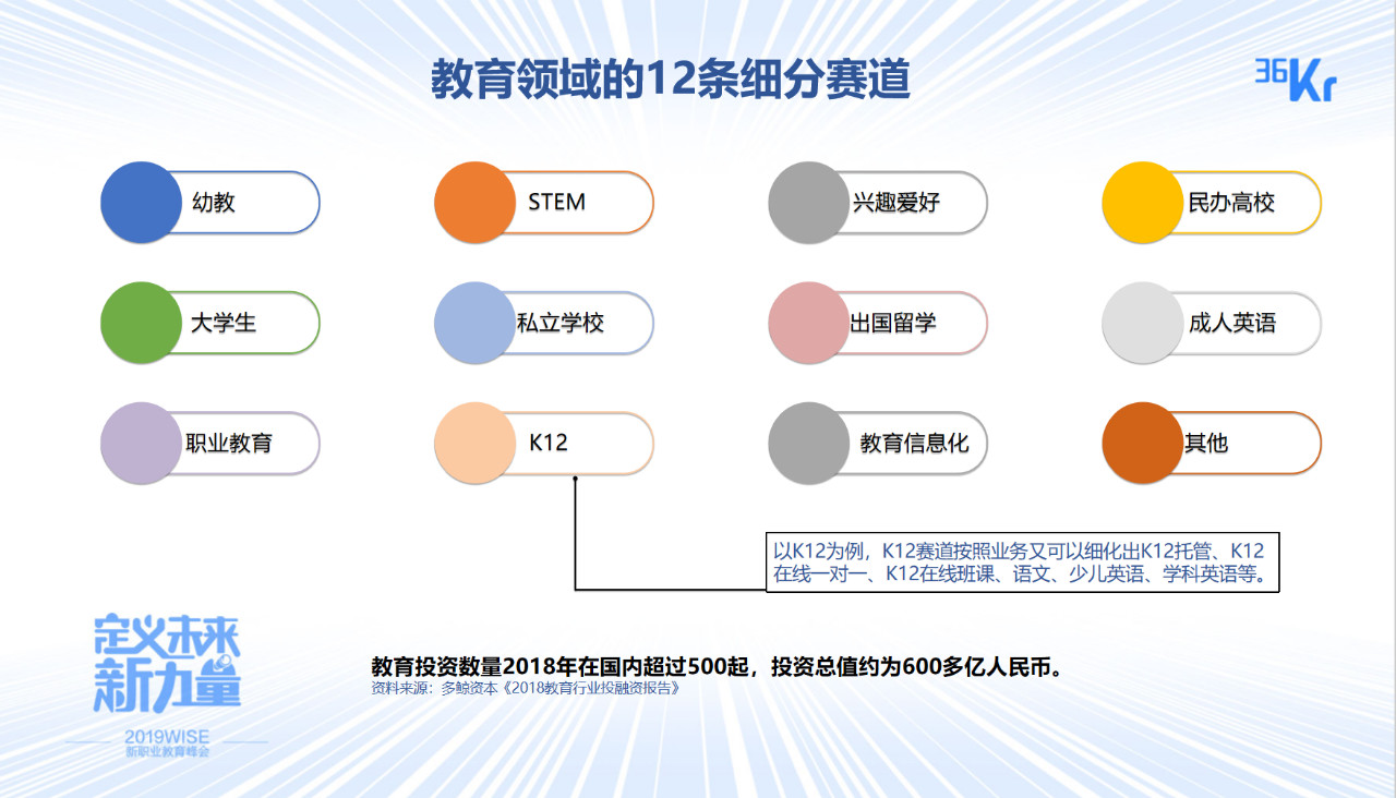 在教育领域有12条细分赛道,每个领域投资的案例非常多。