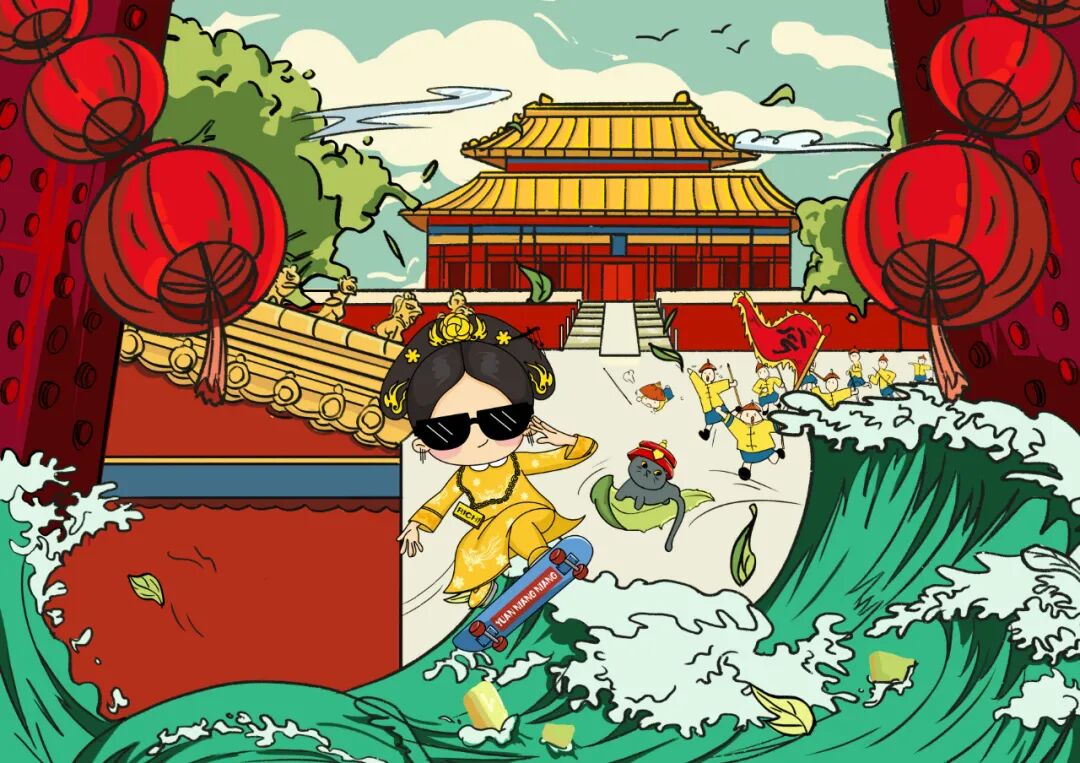 其次,「媛娘娘」的包装设计主打“中国宫廷风”,配色也以宫廷最常见的大红大紫大黄为主,并且还打造了自己的专属IP:一个耍贱卖萌的帝都娘娘。团队将这位媛娘娘的人设定位为“宫廷美食家”,并为其打造了完整的世界观。