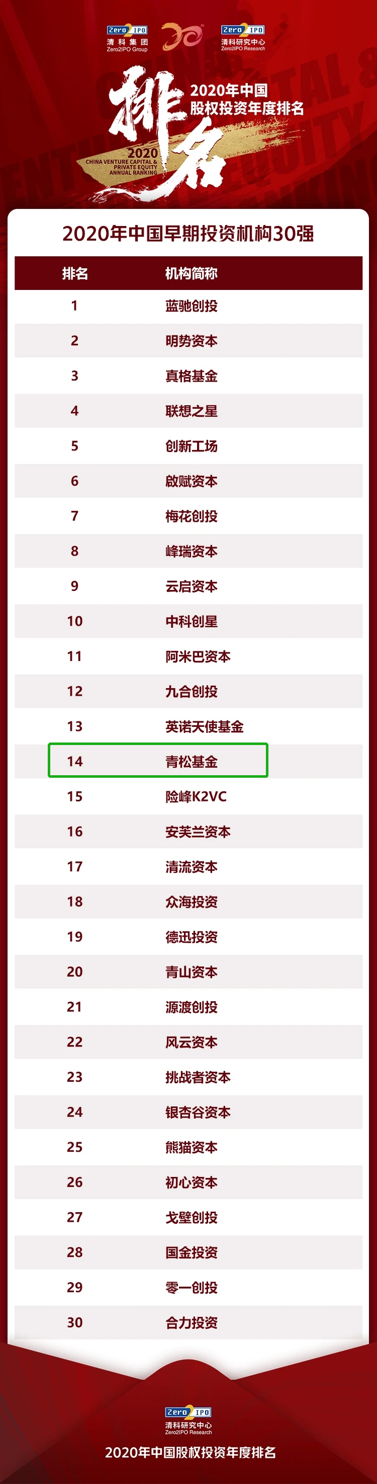 青松基金荣获2020年中国早期投资机构15强、2020年中国文化消费领域投资机构30强。这是自清科集团2014年设立天使/早期榜单以来,青松基金连续第7年上榜。