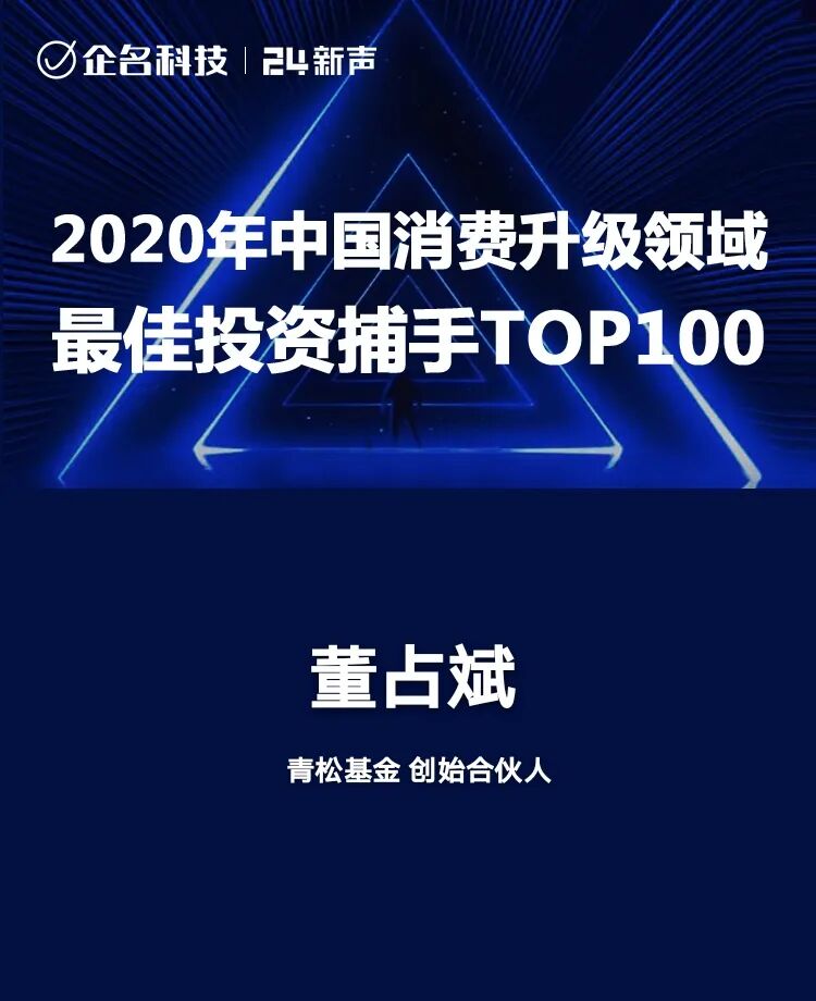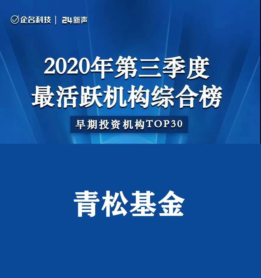 作为国内领先的早期投资机构,青松基金及其合伙人曾多次获得:清科中国早期投资机构/投资人Top10、中国教育领域投资机构Top10、中国文化消费领域投资机构Top30、投资界中国投资人Top100;投中中国最佳早期创业投资机构/投资人Top10;达沃斯论坛2019年度全球最佳基金Top30、全球最具影响力基金投资人Top30;中国母基金联盟最佳早期投资基金Top3等奖项。