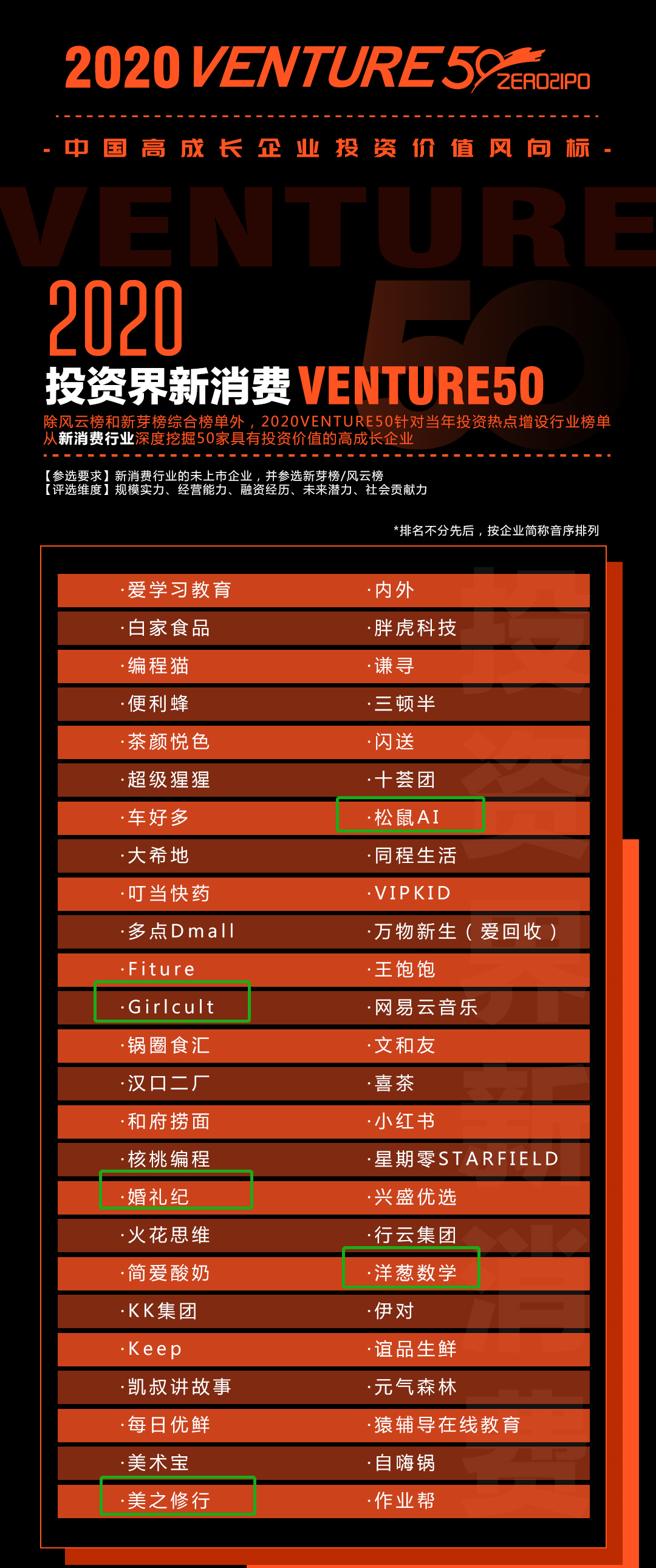 青松基金的5家优秀被投企业——婚礼纪、松鼠AI、洋葱数学、Girlcult、美之修行,荣登2020投资界新消费VENTURE50榜单,成为新消费领域年度最具有投资价值的高成长企业TOP50。