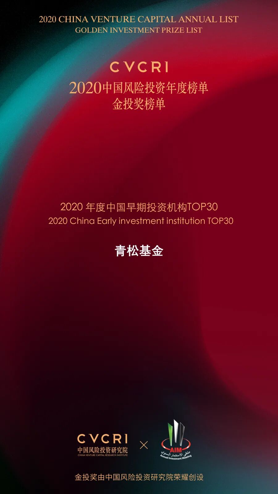 青松基金再获2020中国早期投资机构TOP30,由中国风险投资研究院颁评