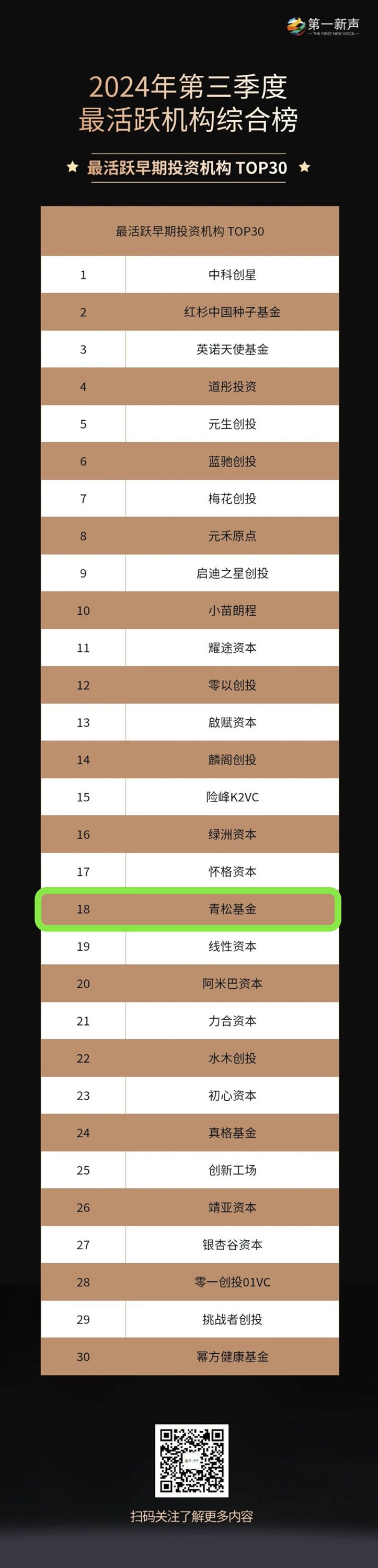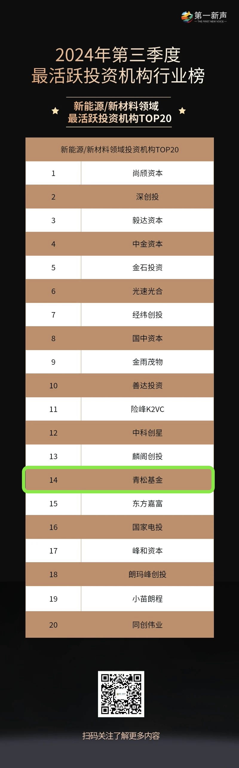 青松基金上榜2024年第三季度最活跃机构综合榜-「最活跃早期投资机构TOP 30」、2024年第三季度最活跃投资机构行业榜-「新能源/新材料领域最活跃机构TOP 20」。