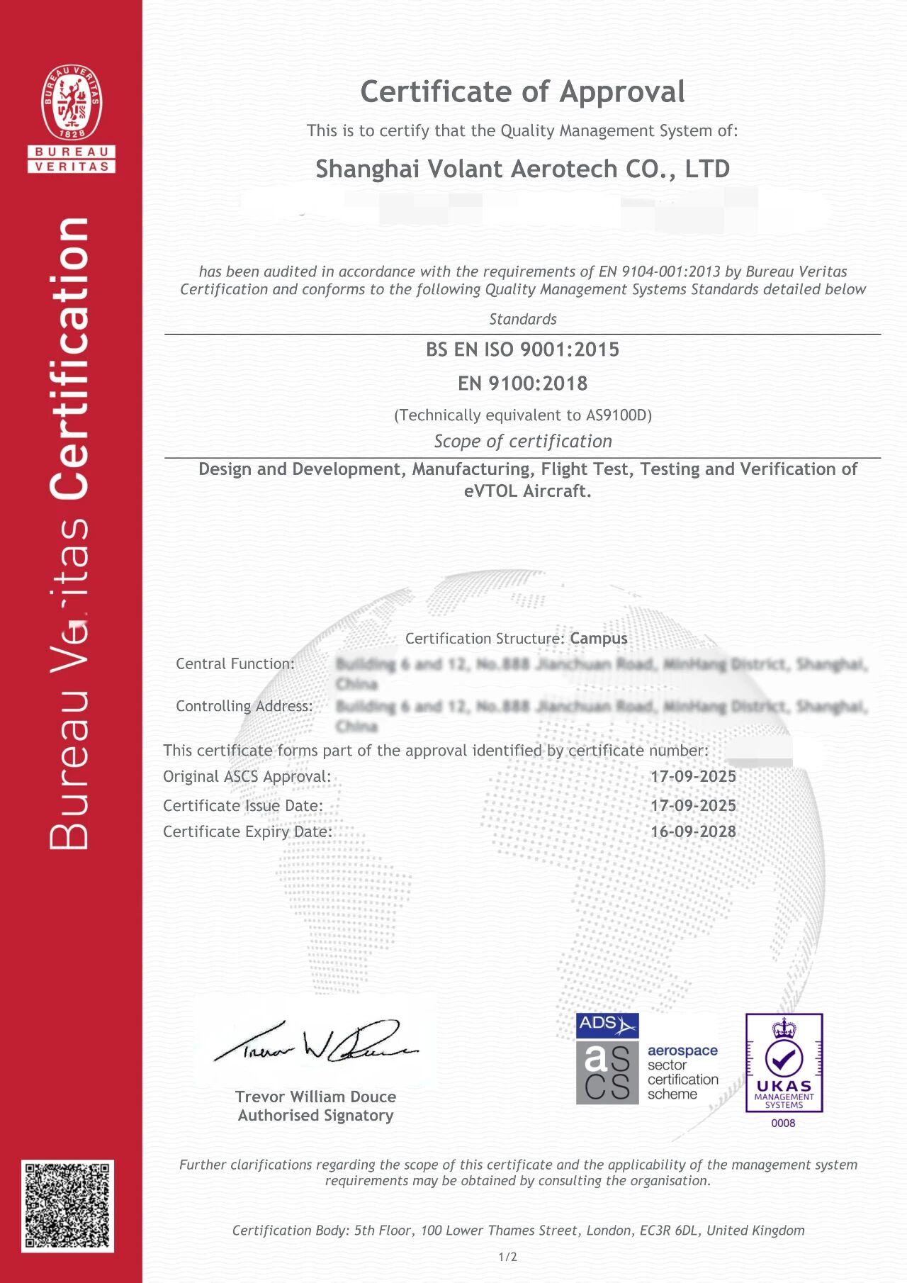 该证书是在ISO9001质量体系要求上开发的航空质量管理体系标准,增加了航空航天行业的特殊要求,旨在确保航空航天产品和服务的高质量和安全性。它要求企业在设计开发阶段就运用专业的分析模式和过程决策工具,进行风险预判,确保 eVTOL 的关键部件达到 “零缺陷” 标准。同时这些过程控制方法还与TC证(型号合格证,Type Certificate)所要求的安全性和可靠性标准相契合,能提升产品在适航审定过程中的信誉和竞争力,普遍业界认可度较高,相当于中国eVTOL企业参与国际竞争的”入场券“,也将增强沃兰特的市场竞争力。