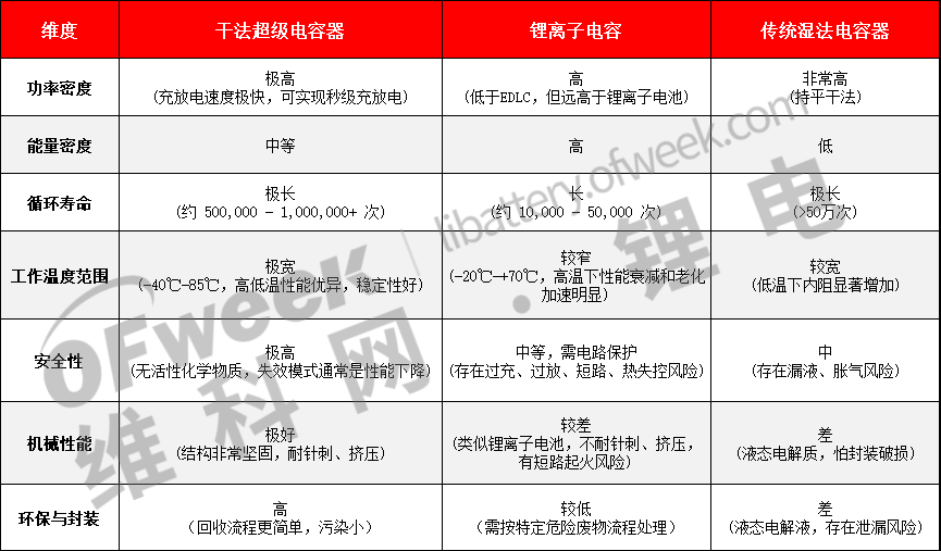 锂离子电容虽具备较高的能量密度,但其功率密度相对有限,大电流放电易导致循环寿命衰减,并存在高低温适应性差及安全性不足等问题。