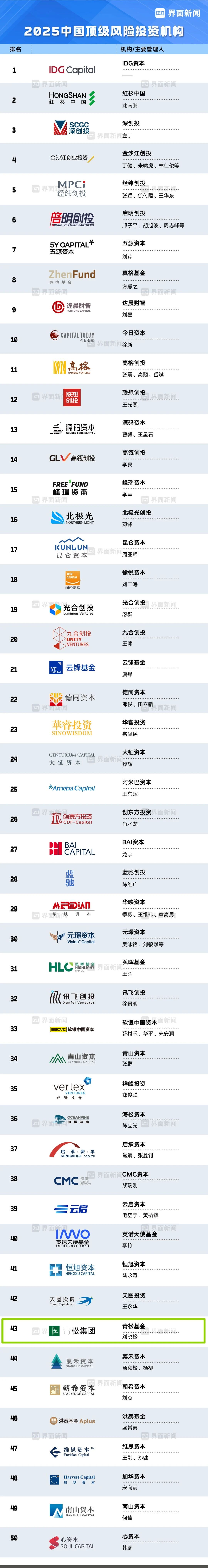 12月23日,界面新闻2025中国顶级风险投资机构TOP50榜单揭晓,青松基金再次上榜。